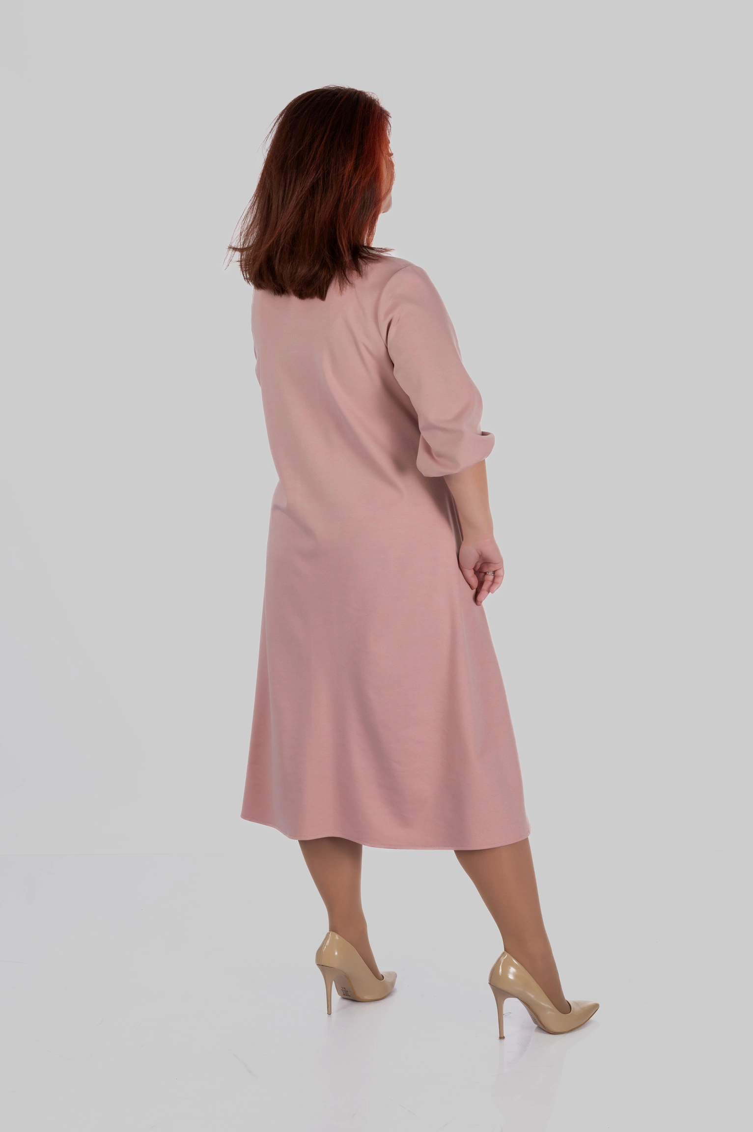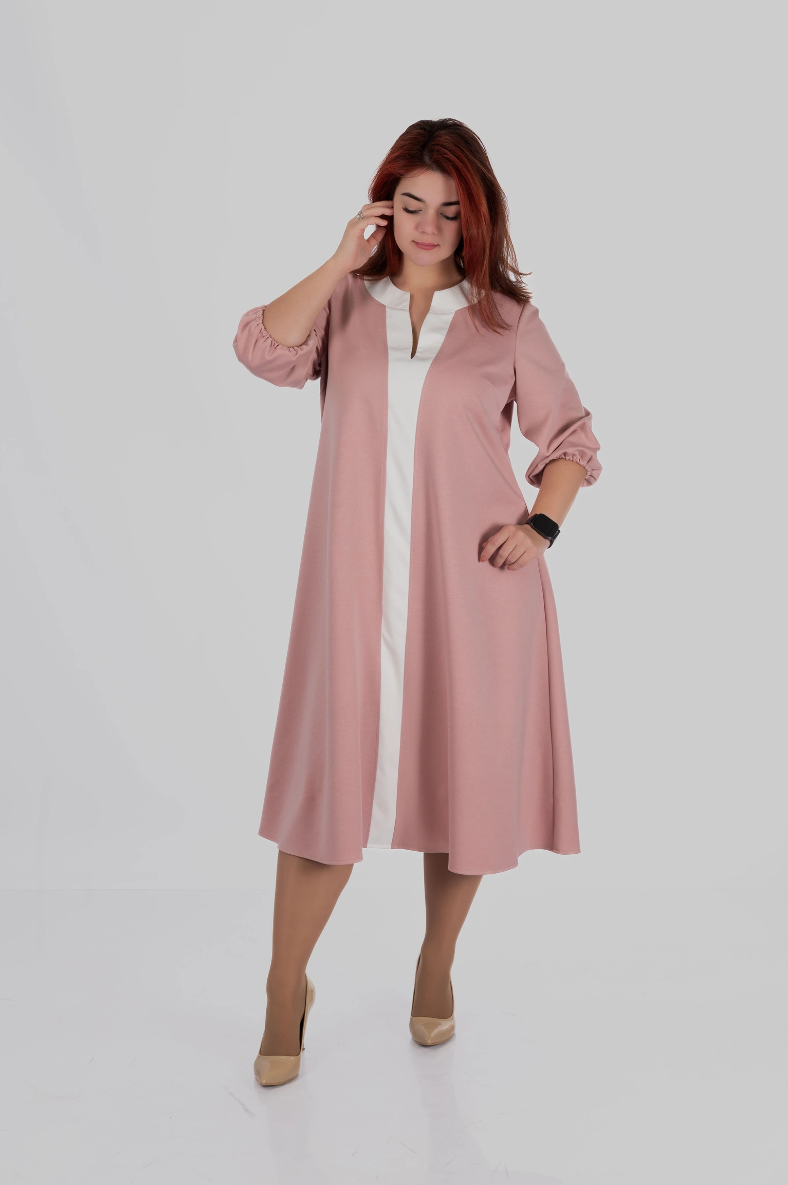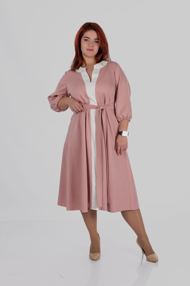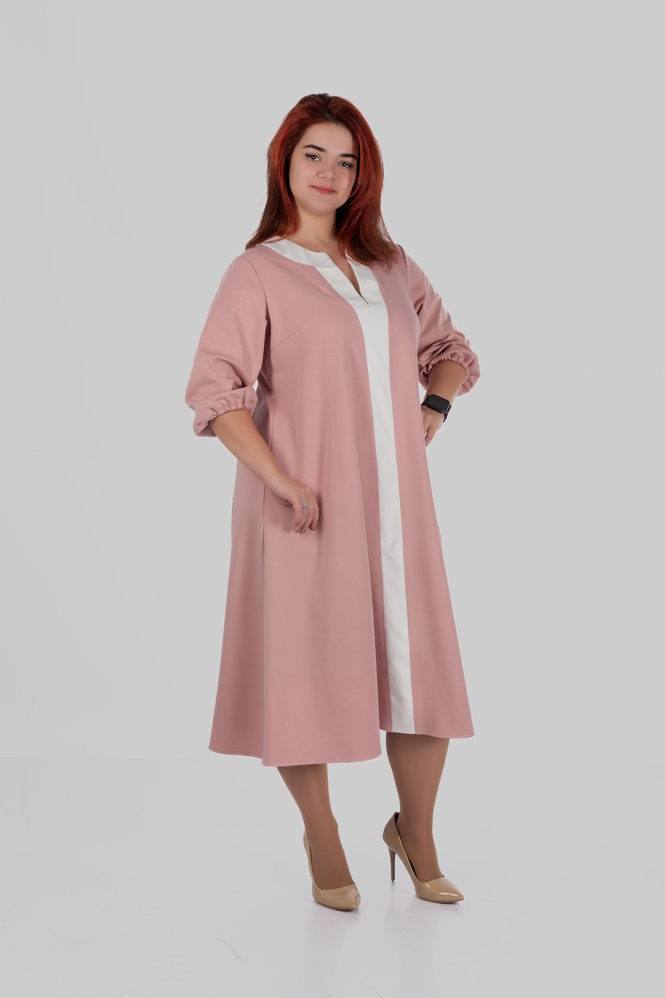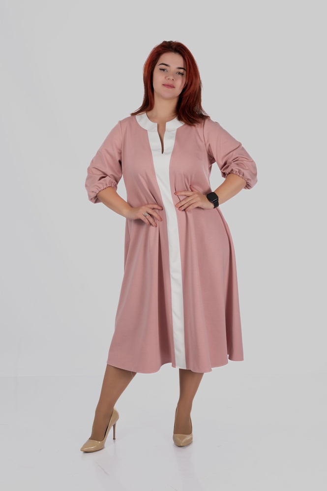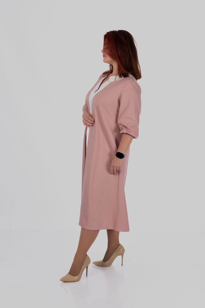 Продуманий крій моделі створений з урахуванням посадки для розмірів 50–64. Сукня формує витягнутий силует, виглядає легкою і елегантною та залишається комфортною протягом усього дня.
