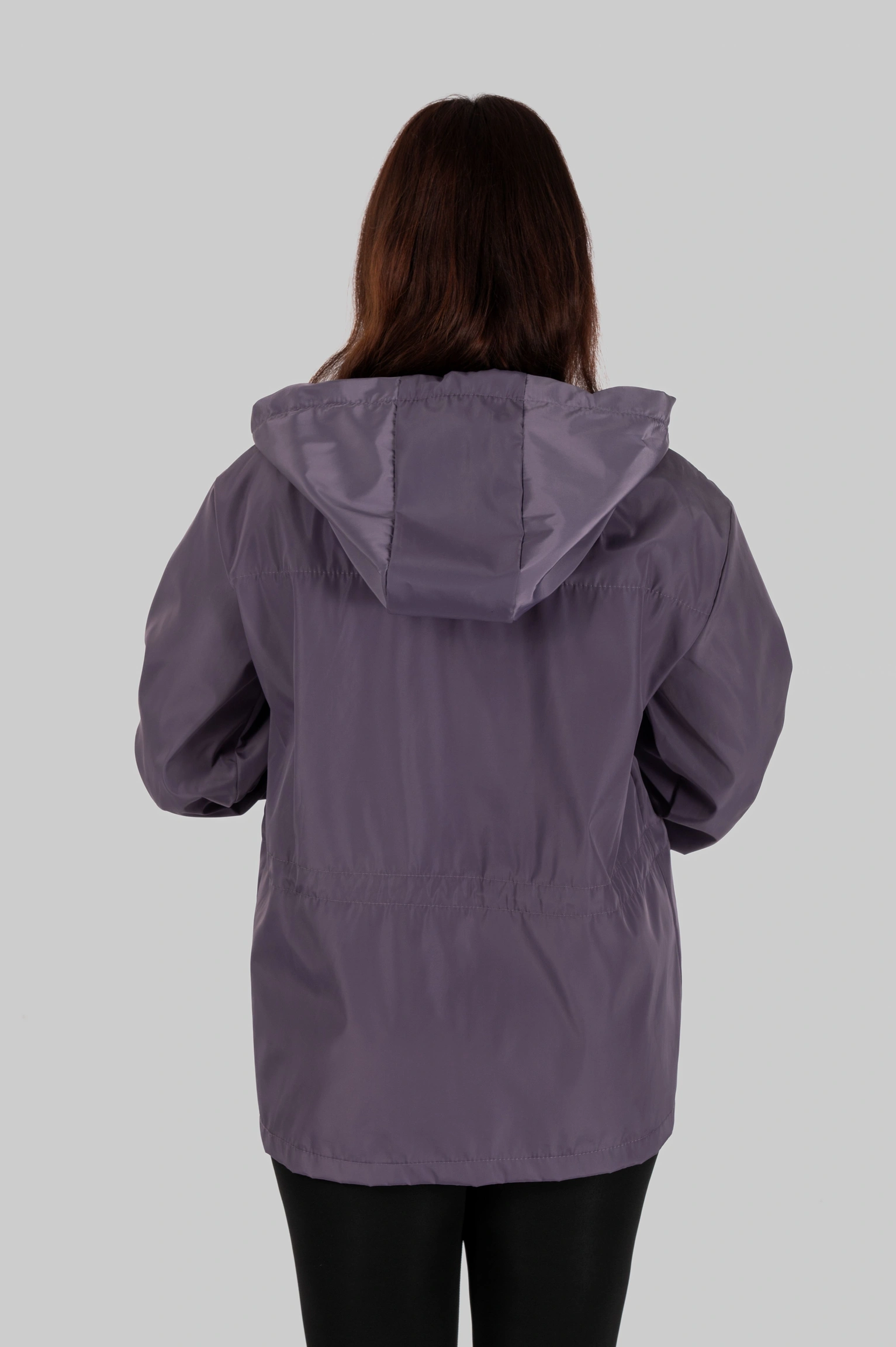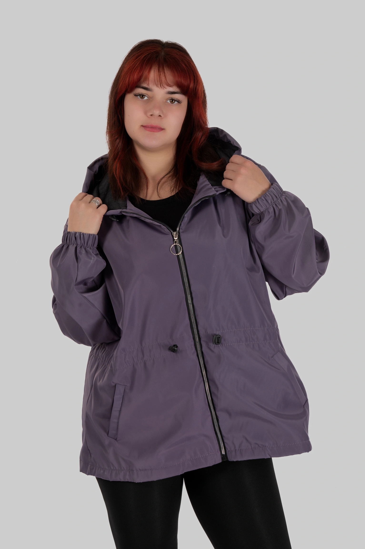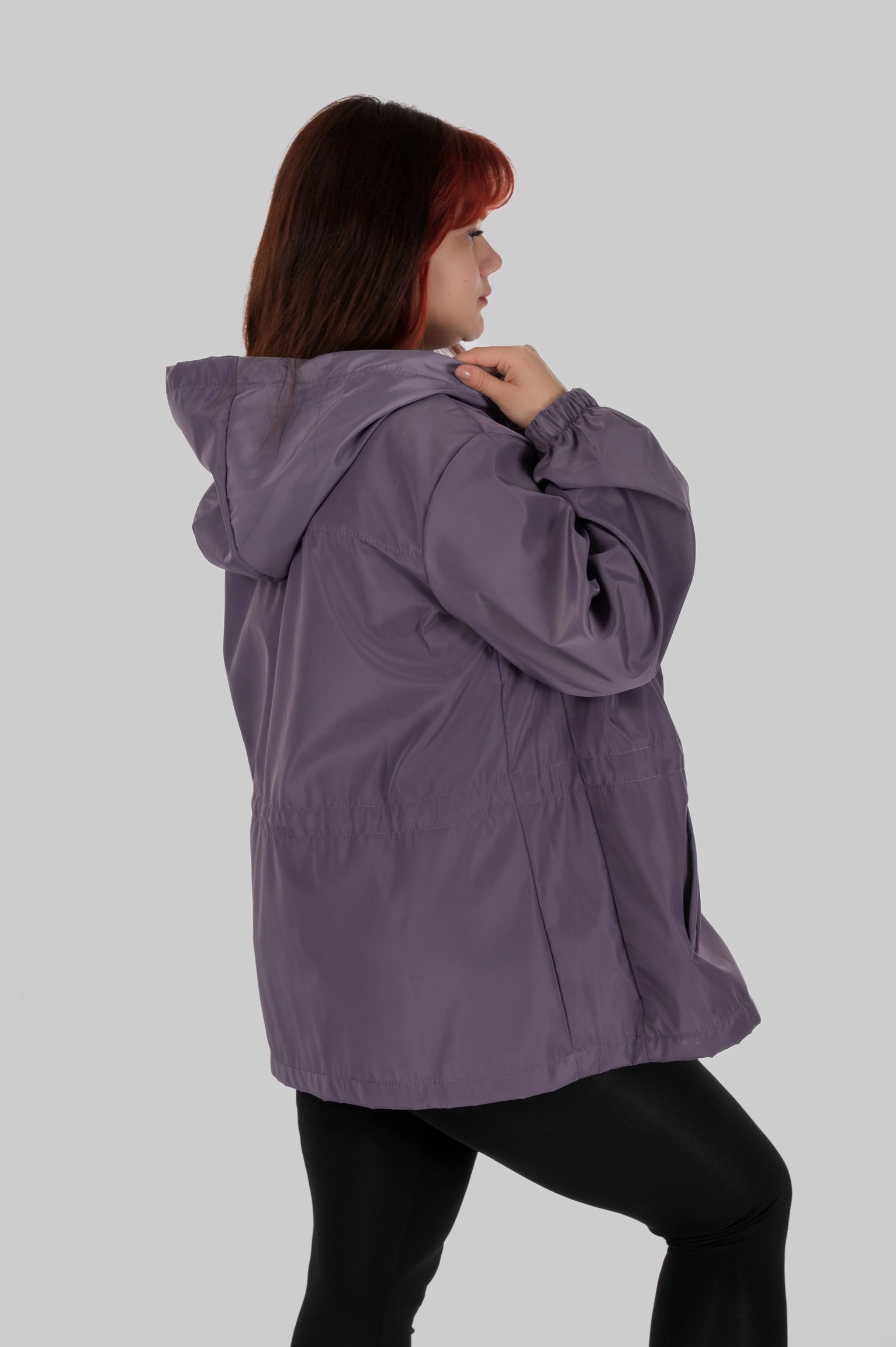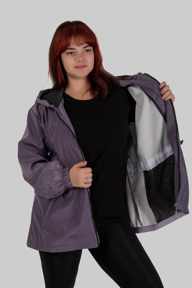 Плащівка з трикотажною основою поєднує щільність зовнішнього шару та еластичність внутрішньої структури. Матеріал не прилипає до тіла, не втрачає силует під дощем і не створює ефекту жорсткої оболонки.
