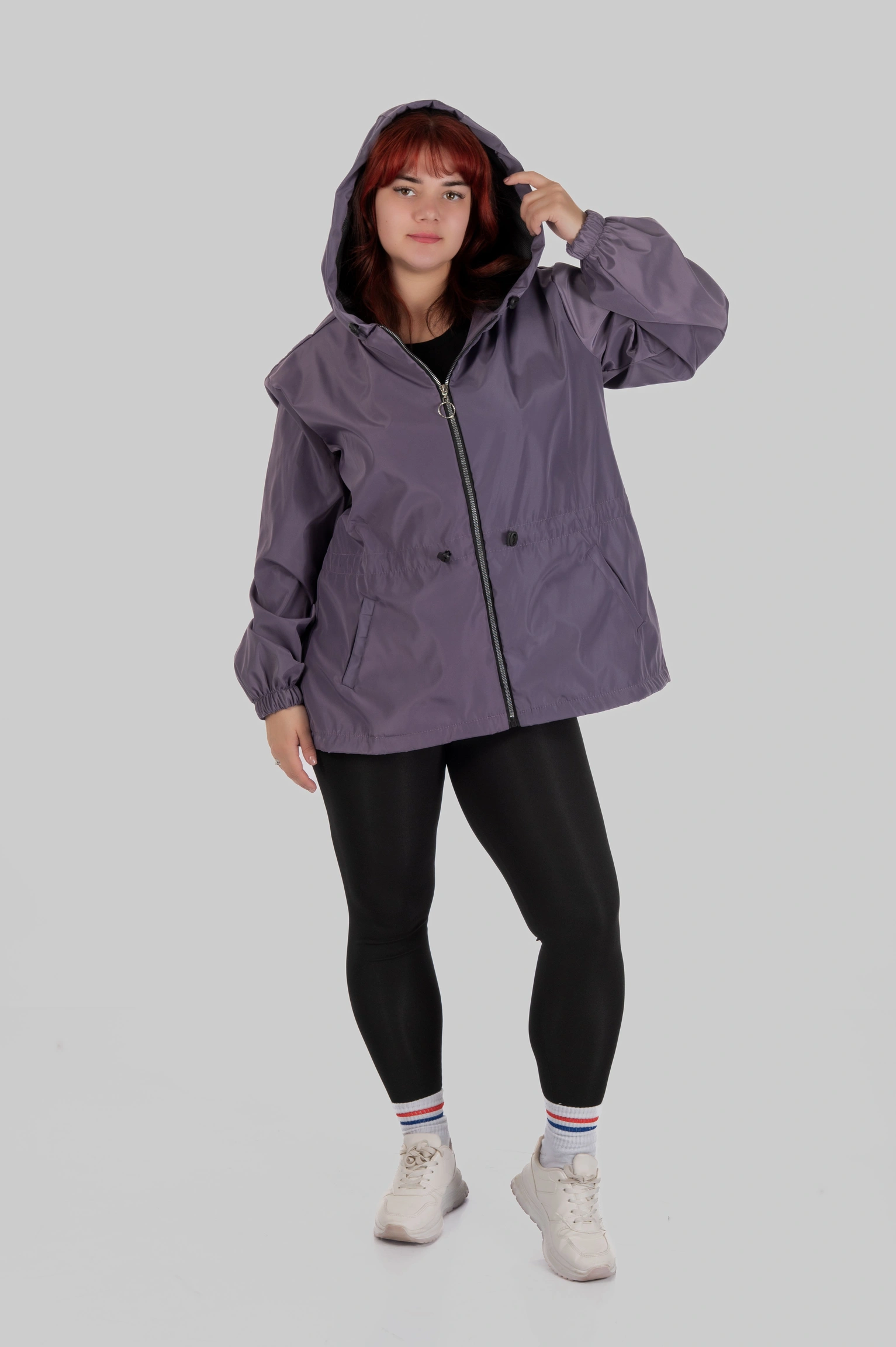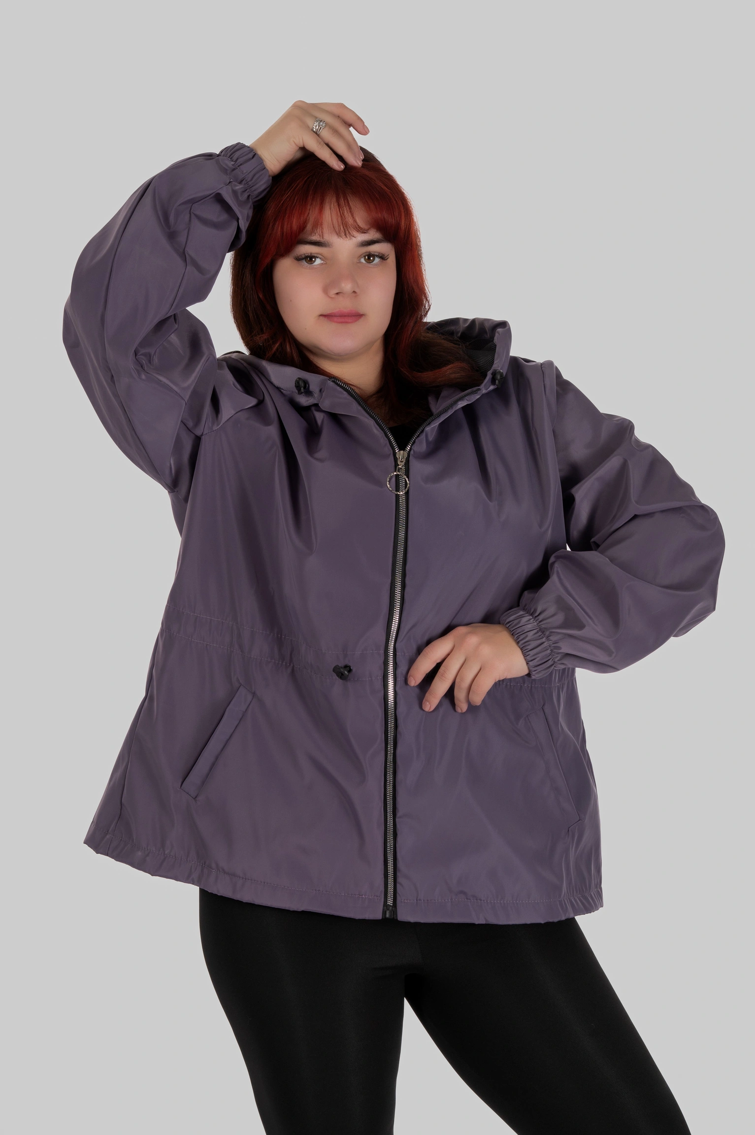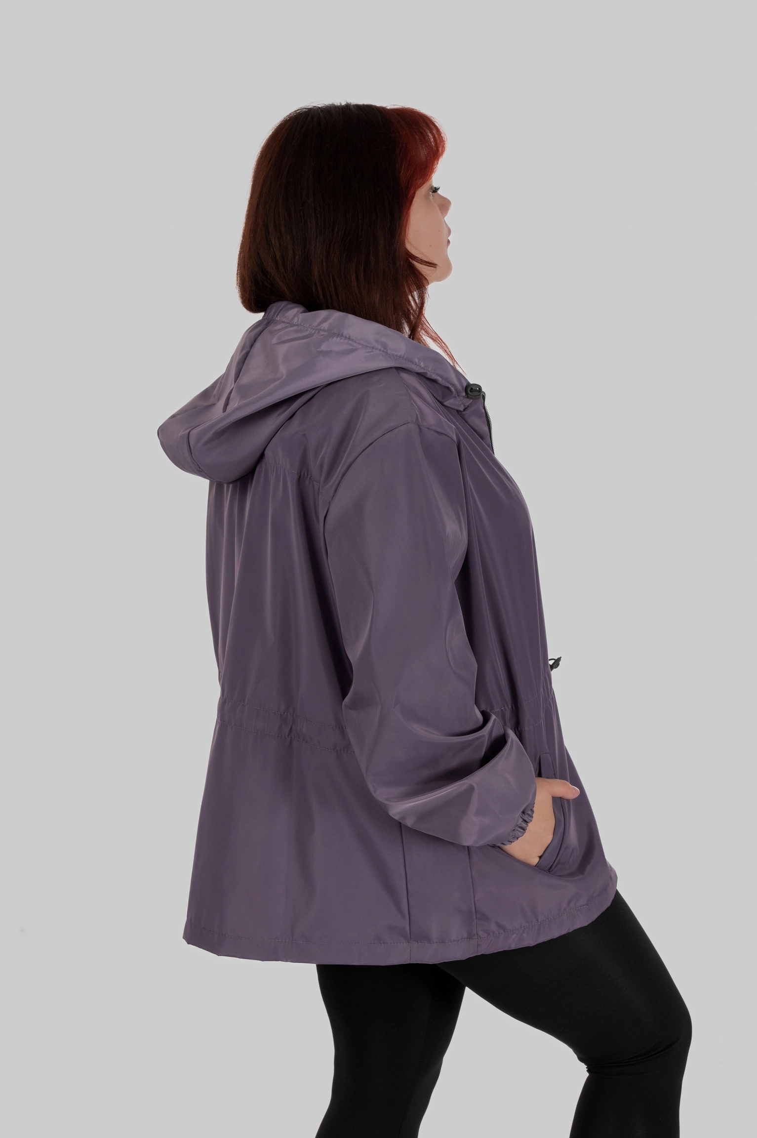 Плащівка з трикотажною основою поєднує щільність зовнішнього шару та еластичність внутрішньої структури. Матеріал не прилипає до тіла, не втрачає силует під дощем і не створює ефекту жорсткої оболонки.