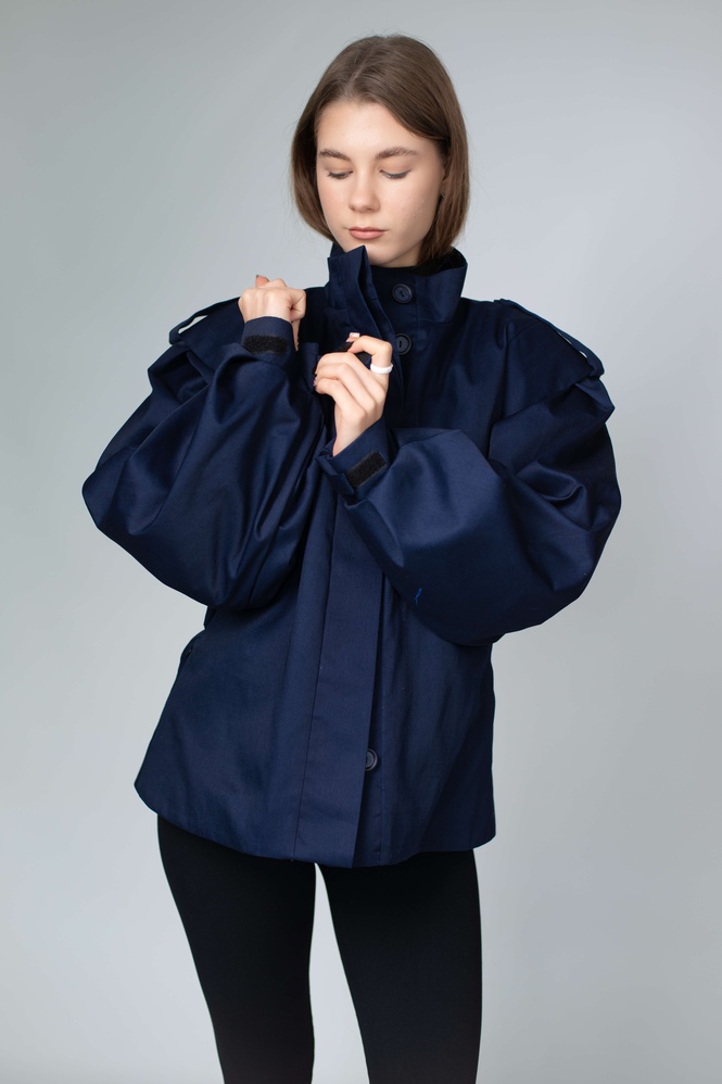 - Обʼємні рукави з манжетами на липучках — можна коригувати обхват
