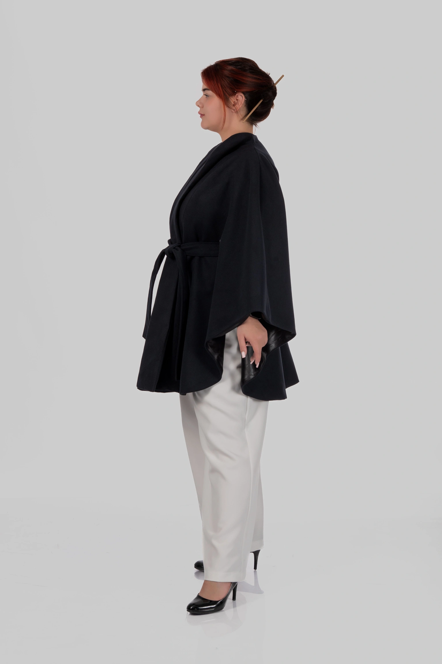 Цей кейп працює на всі типи фігур і будь-який зріст. Саме завдяки балансу крою, довжині і формі борту він не “ріже” фігуру, а створює цілісний, витягнутий силует.